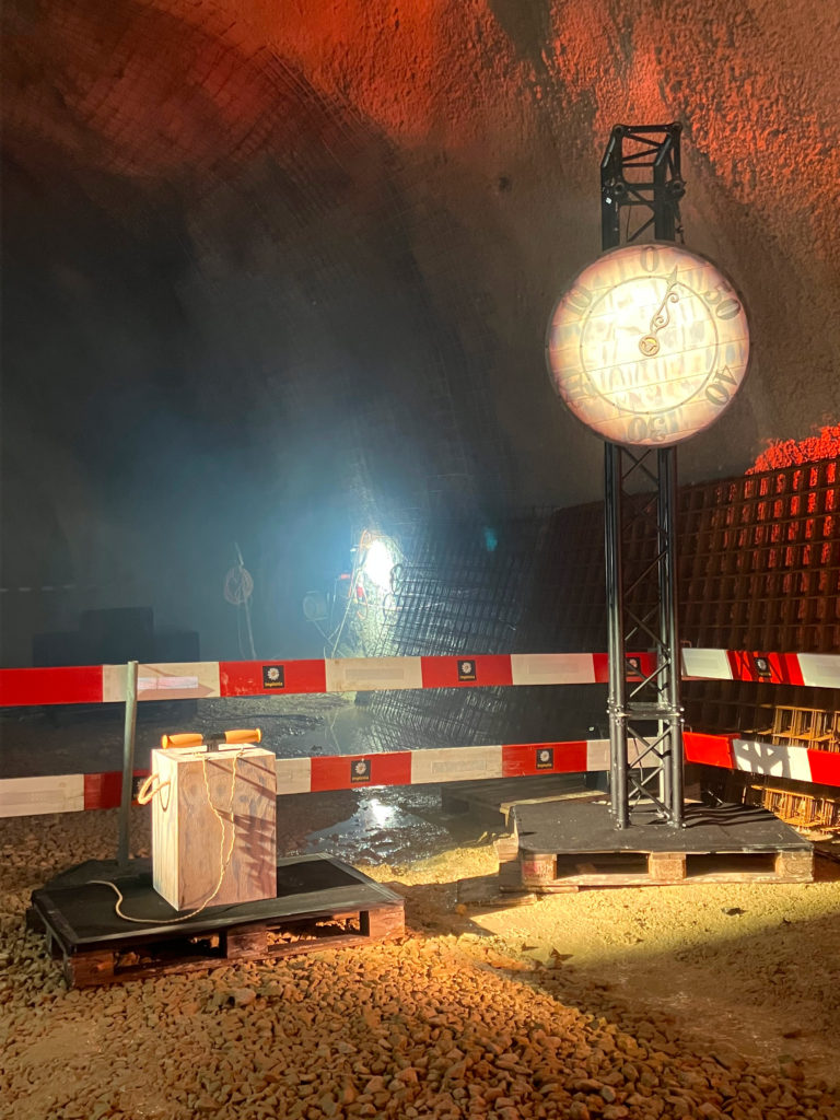 Le tunnel étant toujours en chantier, l’installation par notre équipe représentait un défi important. Le montage a été réalisé par une vingtaine de monteurs et monteuses répartis en deux équipes, le vendredi après-midi, puis dans la nuit du vendredi au samedi. Plus de 200 projecteurs ont été installés le long du tronçon de 500 mètres pour l’illuminer et le mettre en valeur.